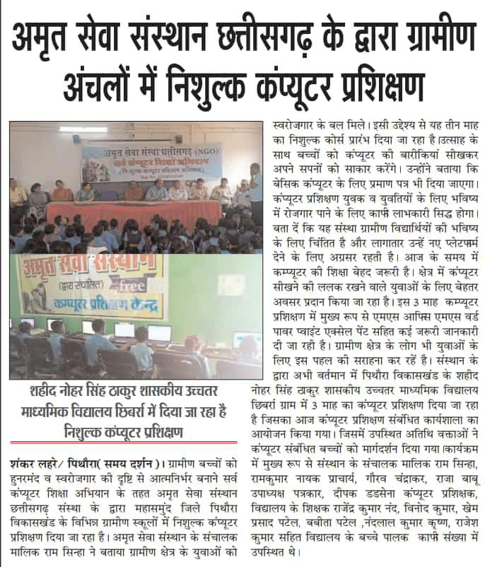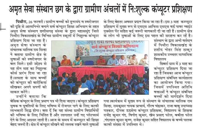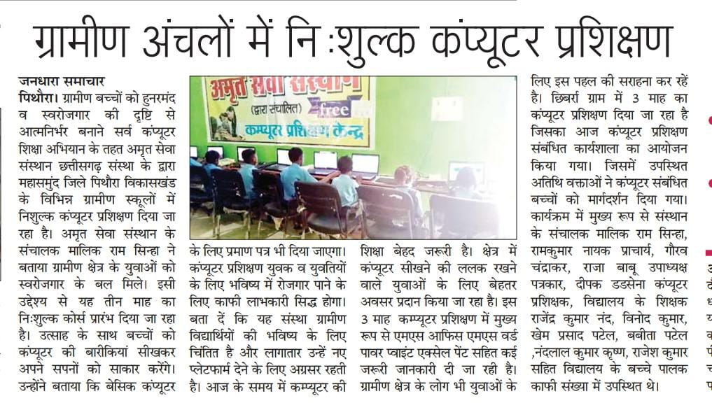 अमृत सेवा संस्था छ.ग. के द्वारा निः शुल्क कम्प्यूटर प्रशिक्षण